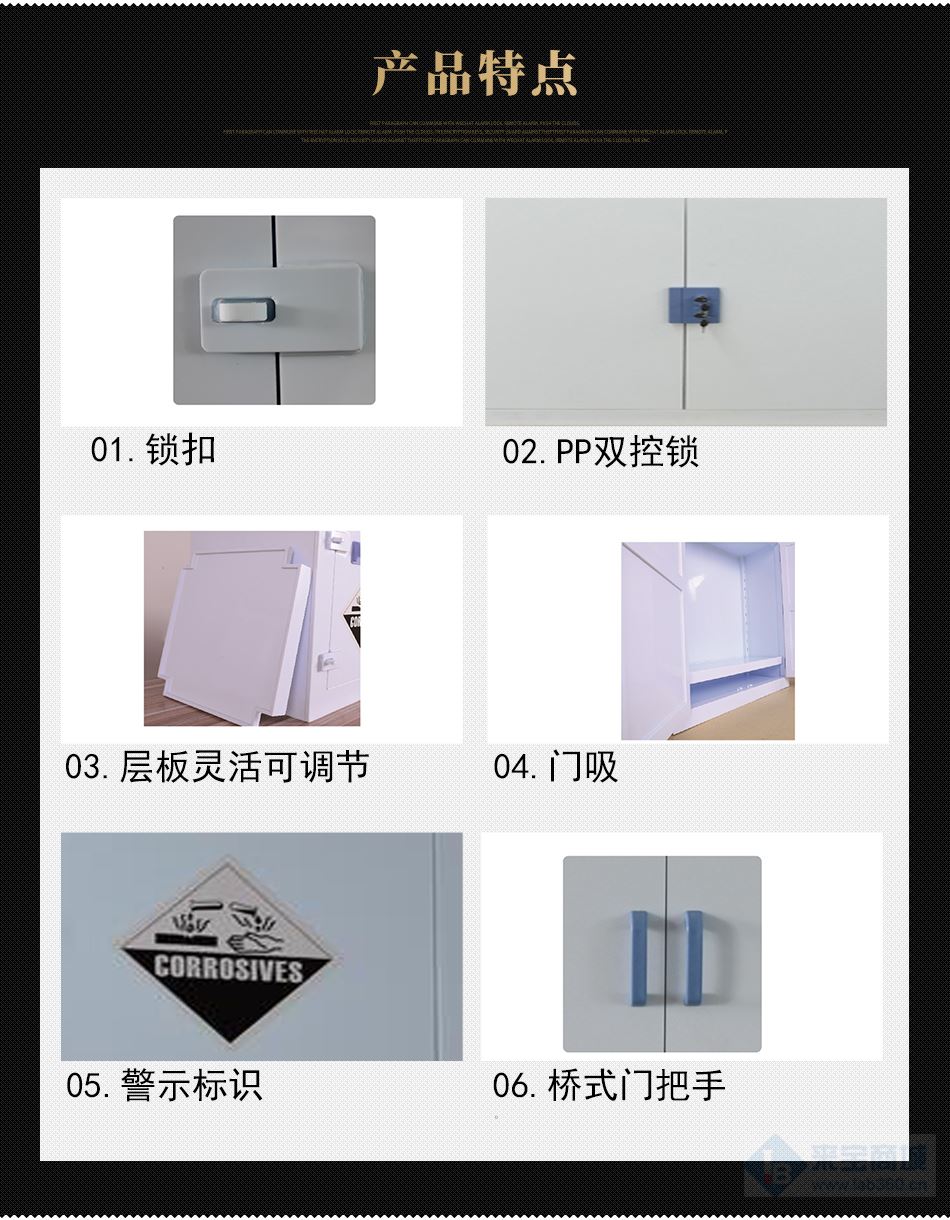 OLB系類強酸強堿存儲柜,特別針對強腐蝕性化學品的存儲和防滲漏而設計,使用存放具有強腐蝕性的化學品物質(例如硫酸、鹽酸、KOH、NaOH等化學品物質)。