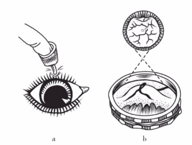 a.鞏膜壓迫的位置 b.檢眼鏡下所見