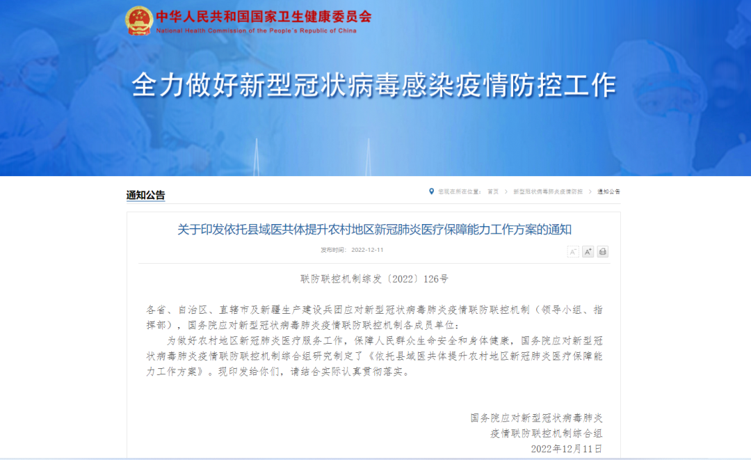 2022年12月,國務院應對新型冠狀病毒肺炎疫情聯防聯控機制綜合組研究制定了《依托縣域醫共體提升農村地區新冠肺炎醫療保障能力工作方案》。
